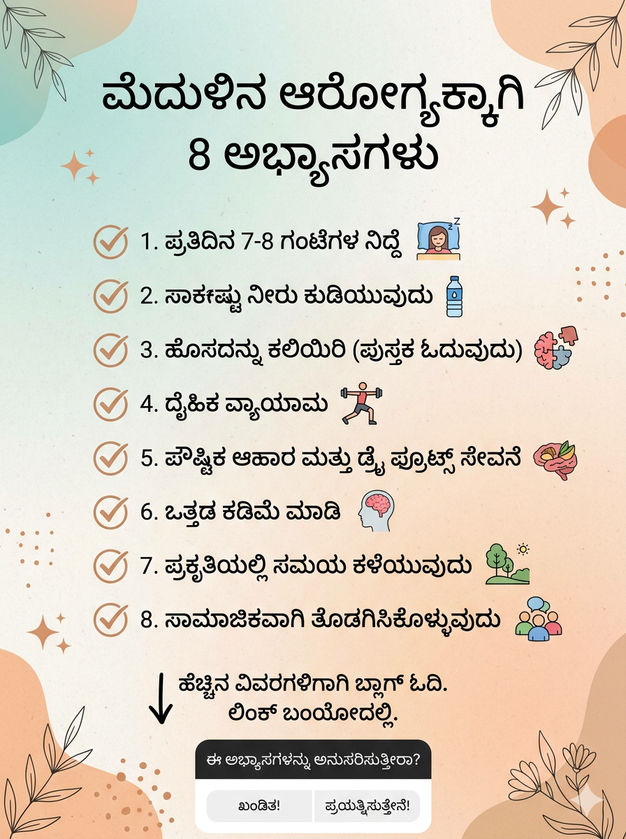 ನಮ್ಮ ಮೆದುಳು ಪ್ರಕೃತಿಯು ನಮಗೆ ನೀಡಿರುವ ಅತ್ಯಂತ ಅಮೂಲ್ಯವಾದ ಕೊಡುಗೆ. ನಾವು ಅದನ್ನು ಎಷ್ಟು ಜಾಗರೂಕತೆಯಿಂದ ನೋಡಿಕೊಳ್ಳುತ್ತೇವೆಯೋ, ಅದು ನಮಗೆ ಅಷ್ಟು ದೀರ್ಘಕಾಲದವರೆಗೆ ಚುರುಕಾದ ಸ್ಮರಣಶಕ್ತಿ ಮತ್ತು ಉತ್ತಮ ಜೀವನವನ್ನು ನೀಡುತ್ತದೆ. ಈ ಲೇಖನದಲ್ಲಿ ಚರ್ಚಿಸಿದ 8 ಹವ್ಯಾಸಗಳು ಅಂದರೆ - ನೀರು ಕುಡಿಯುವುದು, ಸರಿಯಾದ ನಿದ್ದೆ, ನಿರಂತರ ಕಲಿಕೆ, ದೈಹಿಕ ವ್ಯಾಯಾಮ, ಸಾಮಾಜಿಕ ಸಂಪರ್ಕ, ಓದುವಿಕೆ, ಪ್ರಕೃತಿಯ ಒಡನಾಟ ಮತ್ತು ಸರಿಯಾದ ಆಹಾರ - ಇವು ಕೇವಲ ಮಾಹಿತಿಯಲ್ಲ, ಇವು ನಿಮ್ಮ ಮೆದುಳಿನ ಆರೋಗ್ಯದ ಸೂತ್ರಗಳು.